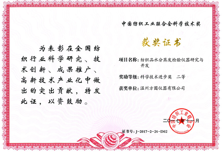 溫州方圓儀器榮獲二項(xiàng)“紡織之光”2017年度科學(xué)技術(shù)進(jìn)步獎二等獎
